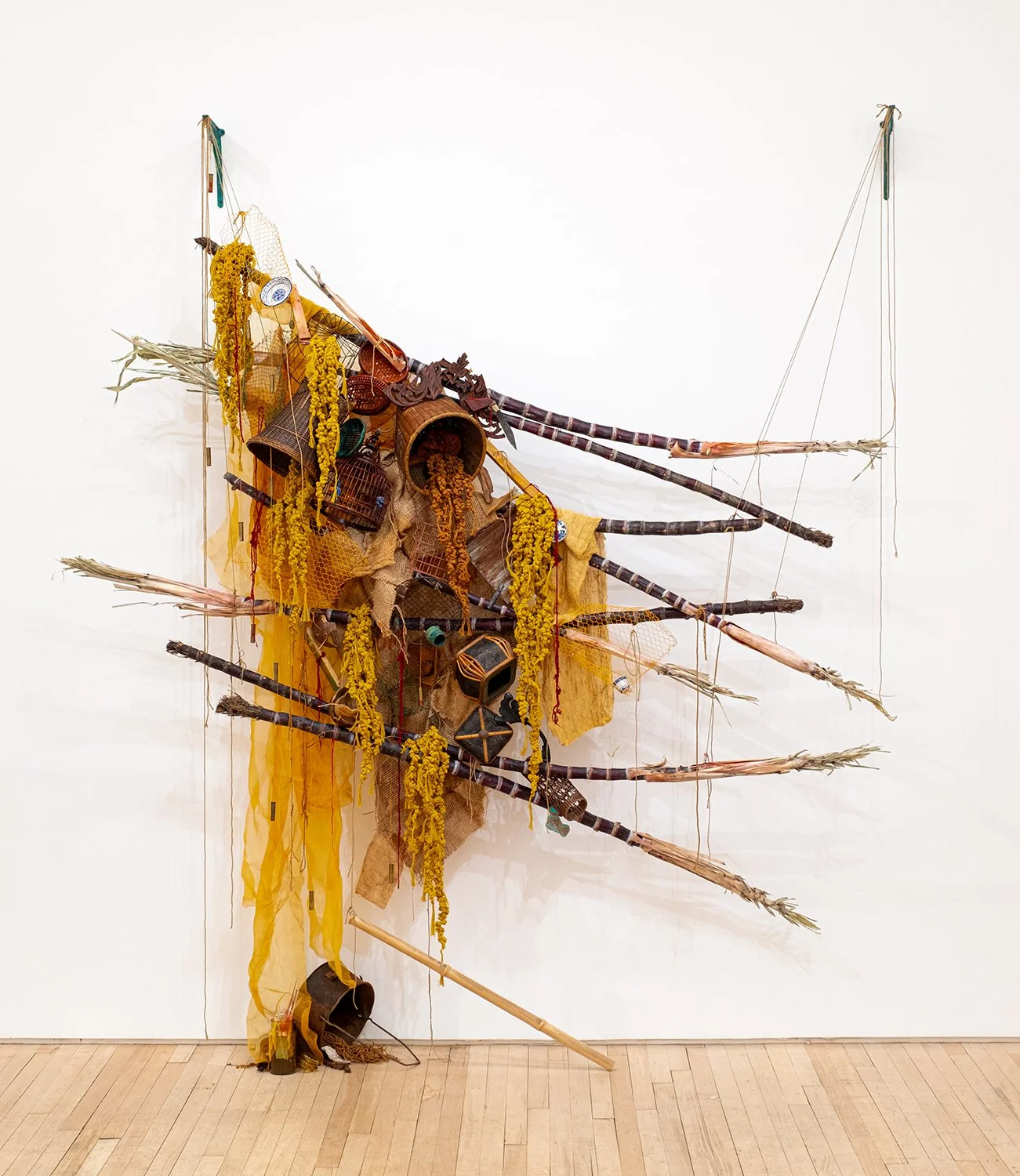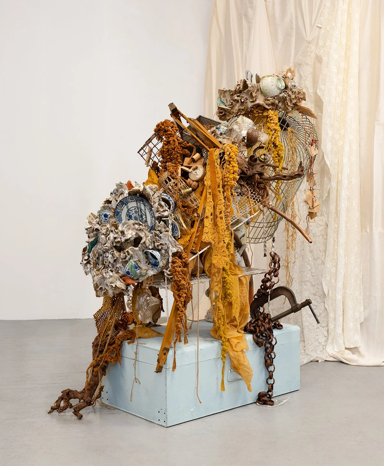carry history in their grain. Reclaimed silk, rusted farm tools, porcelain shards, woven rattan, sugarcane stalks. Brought together into precarious sculptural forms, these objects trace how forces of labor, conquest, and dispossession are pressed into bodies and land, and hold what persists in their wake.